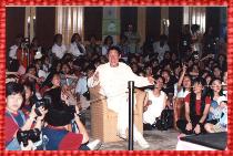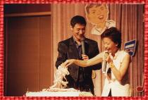 回 顧: 當所有人還籠罩在「頭髮亂了」的狂野魅力中,學友來了!穿著一件亮橙色的運動外套,帶著滿身的陽光,排除忙碌的宣傳通告,專程來台與友友歡渡一個輕鬆愉快的星期假日下午。活動一開始,自稱是學友超級歌迷的主持人曾國城就迫不及待地和友友搶著點起歌來,反觀學友則是一付「兵來將擋,水來土掩」的篤定模樣,一首接著一首滿足大家的渴望。在分組競賽單元中,不但友友們全情投入各項遊戲,興緻高昂的爭取小組得分, 並且發揮高超的創造力,比賽設計「頭髮最亂」的特殊造形;學友更自願擔任「示範組」,大玩水蜜桃(屁股)寫字、火燄大挑戰、聽力節拍大考驗等遊戲,High到最高點!當然,友友俱樂部年度聚會一定少不了已經不太「驚」的「喜」-為學友慶生切蛋糕。在友友同心祝賀「生日快樂」的歡呼聲中,學友一一拆開各組精心準備的生日賀禮:巨型的熊布偶、網球造型的手錶、檀木雕刻的小佛像、「好爸爸育兒手冊」……,還有一整套的套嬰兒用品。每一樣禮物都包含了友友對學友的祝福與關懷,也唯有真正關心學友的朋友,才能如此貼心地了解學友的喜好,學友在感動之餘,亦不忘在許願時期望:「所有人身體健康,把我的幸運分享給大家。」